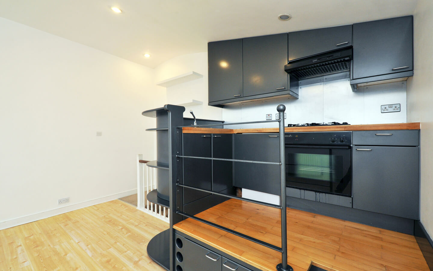 Modern fitted kitchen, well equipped with worktop space and a gas hob cooker.